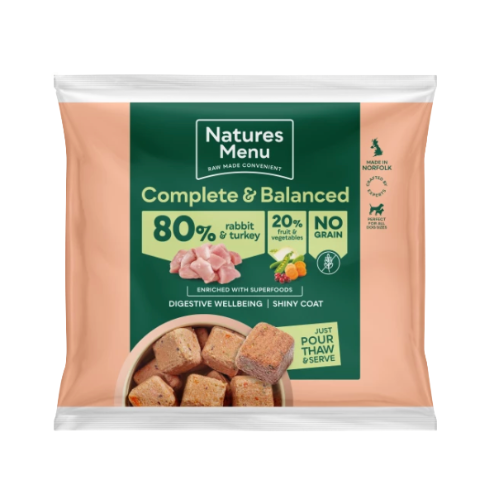 These raw rabbit and turkey dog food nuggets are a great way to introduce a novel protein, with the full, appetising flavour of rabbit. As with all our complete and balanced meals, you can feed this raw rabbit and turkey dog food with the peace of mind that comes with choosing a food that’s crafted by our experts and made to FEDIAF guidelines. Our Natures Menu 80/20 dog food rabbit and turkey nuggets are complete and balanced and made with the highest quality, natural ingredients you can see and understand.